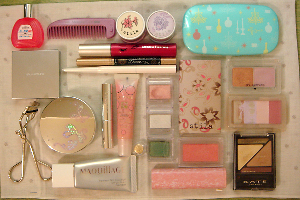 眉筆、眼線液、睫毛膏、腮紅刷(粉紅雲彩花紋,跟化妝包一樣在日本買的)